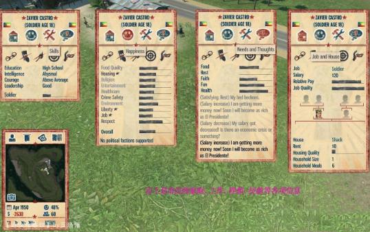 例如以上這位18歲士兵,他的個人信息分別有4大項分別是:工作與家庭、心情、技能、需求和想法。