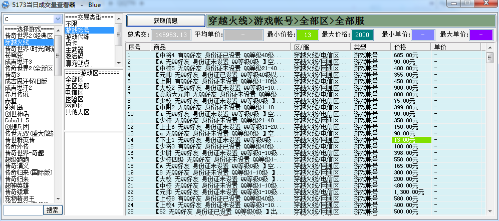 5173是一個大型游戲交易平臺,玩家在5173進行游戲帳號交易、游戲幣交易、代練、寄售擔(dān)保等等。5173成交量查詢軟件一款方便使用的查詢5173當(dāng)日成交量查看器,