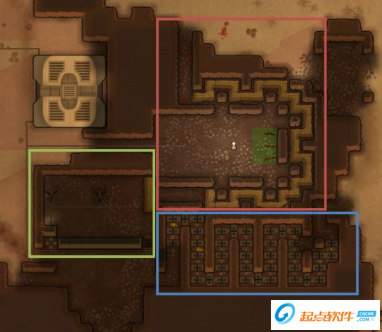 2.綠色區(qū)域?yàn)榕谂_(tái)室(很重要),一是作為誘餌吸引敵人進(jìn)入紅色區(qū)域,二是當(dāng)動(dòng)物發(fā)瘋時(shí)射殺動(dòng)物,因?yàn)閯?dòng)物優(yōu)先攻擊小人,如果你在紅色區(qū)域設(shè)伏還是會(huì)受傷;