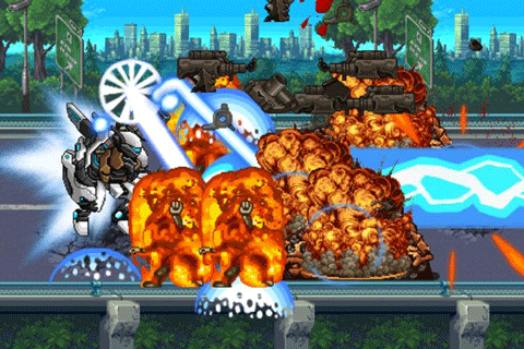 游戲雖然還是有模仿合金彈頭的痕跡,比如槍支的彈道設計和補充彈藥的道具設計,都有合金彈頭的影子,但是本作還是以創(chuàng)新的東西更為突出,首先血條的出現(xiàn)讓戰(zhàn)斗的持久力更強,不至于一槍斃命,然后就是機甲變身了,這個可是本作最大的亮點,變身的主角全身合金裝甲,非常的帥氣,而且各方面的能力都大幅度的提高,殺敵時總結出來就是一個字,爽。