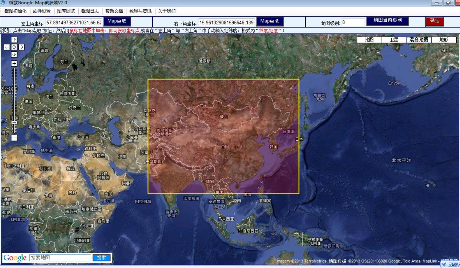 1、大幅面截獲Google Map上的地圖、衛(wèi)星影像、地形圖、混合地圖,拼接并存儲(chǔ)為tif格式的圖像,同時(shí)賦上精確的投影與坐標(biāo);
