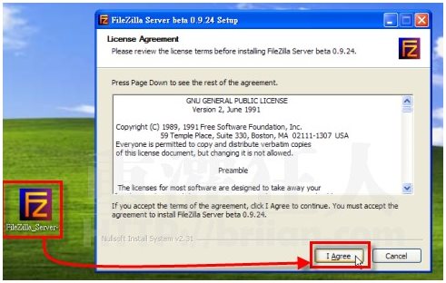 第1步、選用最新版本的filezilla_server。http://filezilla-project.org/。然后在「FileZilla_Server-0_9_24.exe」安裝檔上按兩下滑數(shù)左鍵,執(zhí)行安裝程序,接著再按一下〔I Agree〕按鈕,開始安裝。
