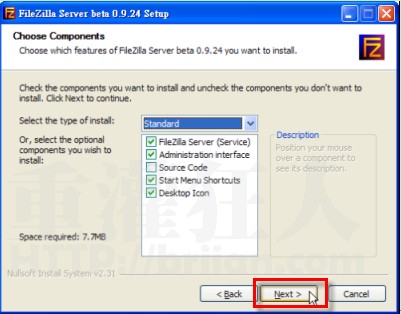 第2步、接著他會問你要安裝哪些元件,安裝方式:默認(rèn)的標(biāo)準(zhǔn),按一下〔Next〕繼續(xù)下一步。