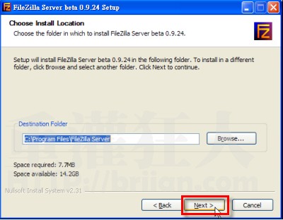 第3步、接著他會問你要將FTP伺服器程式安裝到哪個(gè)資料夾去,強(qiáng)烈推薦安裝到非默認(rèn)路徑,以增加安全系數(shù)。請按一下〔Next〕按鈕,繼續(xù)下一步。