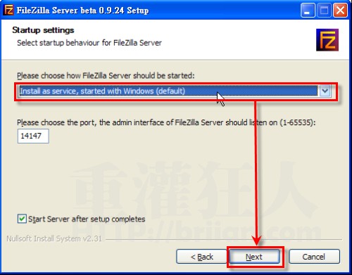 第4步、此步驟是詢問我們是否要讓FTP伺服器在電腦開機(jī)時(shí)自動啟動,請點(diǎn)選【Install as service, started with Windows (default)】,再按一下〔Next〕。這樣FTP伺服器便會自動被安裝成系統(tǒng)的Service,每次開機(jī)后便會自動再背景中啟動并執(zhí)行FTP伺服器的功能。設(shè)置管理端口“14147”,強(qiáng)烈推薦修改此端口,例如:改成38121端口。(注意不要和常見服務(wù)如80端口沖突)