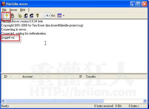 第8步、如圖,出現(xiàn)FileZilla伺服器管理介面后,我們可以在視窗上半部看到目前的FTP伺服器的運(yùn)作狀況,如果有出現(xiàn)「Logged on」或「Server online」的字樣,表示已經(jīng)順利上線。我們可以隨時(shí)點(diǎn)按上方的閃電圖示切換上線、離線,即可手動開啟或關(guān)閉FTP站。