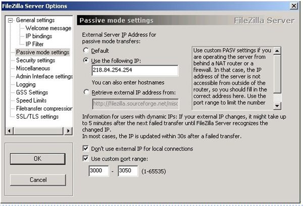 對于在局域網(wǎng)中的服務(wù)器,如果服務(wù)器沒有置于DMZ區(qū),那么強(qiáng)烈建議選中下面的“Use custom port range”定義PASV端口范圍。由于PASV模式中,是服務(wù)器隨機(jī)打開端口,然后把打開的端口號告訴客戶端,讓客戶端連接打開的端口。但是因?yàn)榉?wù)器處于網(wǎng)關(guān)后面,如果網(wǎng)關(guān)那里沒有做對應(yīng)的端口映射,客戶端從外網(wǎng)就無法連接服務(wù)器打開的端口,導(dǎo)致PASV模式連接失敗。在這里限定服務(wù)器打開的端口范圍,然后到連接外網(wǎng)的網(wǎng)關(guān)那里,對服務(wù)器的這些端口做端口映射(虛擬服務(wù))。這需要服務(wù)器和Internet網(wǎng)關(guān)設(shè)備配合設(shè)置,這樣外網(wǎng)的客戶端才能用PASV模式連接進(jìn)來。