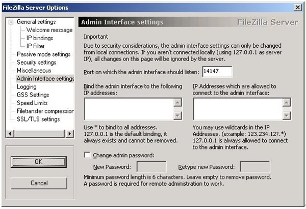 注意:修改端口和密碼非常重要,這是確保Filezilla安全的重點(diǎn),必須修改端口,必須設(shè)置密碼!密碼建議足夠復(fù)雜!可以在管理界面中進(jìn)行修改。