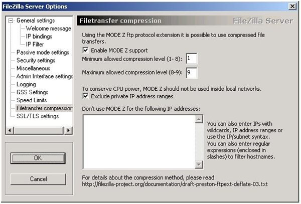 勾選“Enable MODE Z support”就可以啟用本服務(wù)器的MODE Z支持功能,這樣,只要客戶端也支持MODE Z就可以獲得它帶來的性能提升?!癕inimum allowed compression level”和“Maximum allowed compression level”分別設(shè)置最小壓縮率和最大壓縮率。最下面可以輸入不啟用MODE Z功能的目標(biāo)IP。