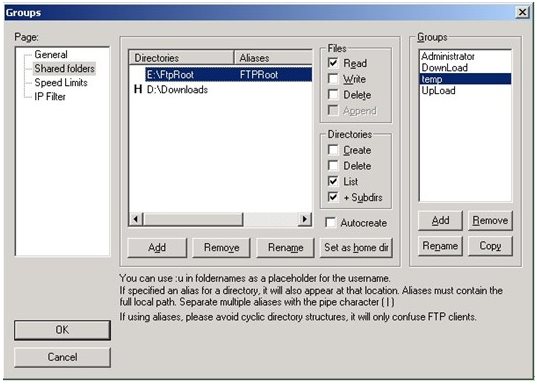 組創(chuàng)建完成以后,點(diǎn)“Shared folders”進(jìn)入目錄權(quán)限設(shè)置頁面。點(diǎn)擊中間區(qū)域的“Add”按鈕添加目錄。默認(rèn)狀態(tài)添加的第一個(gè)目錄即為該組用戶登錄之后看到的主目錄(Home Directory),主目錄前面有個(gè)粗體的“H”標(biāo)識。目錄列表右側(cè)分別是對該目錄的操作權(quán)限設(shè)置,上面是文件權(quán)限設(shè)置,下面是目錄權(quán)限設(shè)置。如果要改變主目錄,只要在列表中選中需要設(shè)置為主目錄的那個(gè),然后點(diǎn)擊“Set as home dir”按鈕即可。