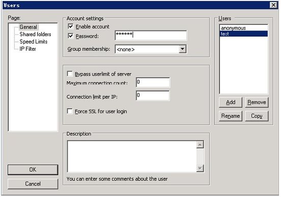 組設(shè)置中的“Speed Limits”和“IP Filter”跟全局設(shè)置里面的速度限制和IP過濾器設(shè)置方法是一樣的,請參照前面的內(nèi)容。只不過這個(gè)是僅僅針對這個(gè)組的用戶生效。而全局設(shè)置是對所有的用戶都生效。設(shè)置完畢之后點(diǎn)擊“OK”按鈕回到主界面。