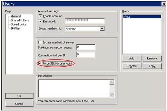 打開“Users”對話框:添加用戶;輸入密碼;選中“Force SSL for user login”,目的是強(qiáng)制使用 SSL,當(dāng)然如果不選的話,要不要使用 SSL,就由客戶端自己選擇了。