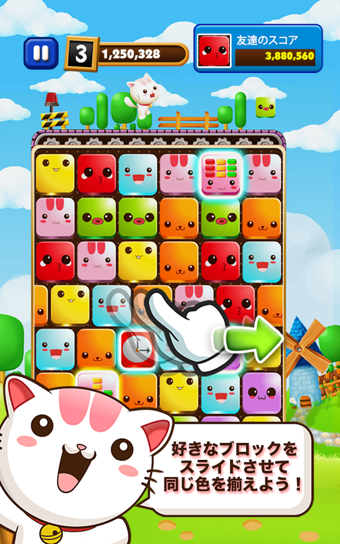 誰都喜歡的三消游戲!從鋪滿了彩色方塊的6x7的棋盤上救出那只小貓?!