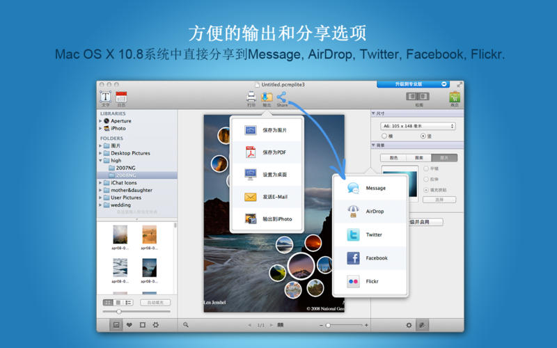 通過(guò)Facebook和電子郵件與您的朋友和家人分享拼貼.MacOSX10.8系統(tǒng)下直接分享到iMessage,AirDrop,Twitter,Facebook,Flickr.