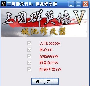 三國群英傳5城池修改器是一款具有五項修改功能的三國群英傳5修改器工具,包括人口、民心、金錢、預(yù)備兵和防御開發(fā)相關(guān)數(shù)值,簡單好用,進(jìn)入游戲后打開修改器按下熱鍵即可。