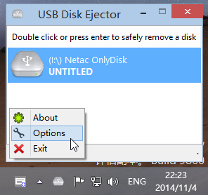 我們還是由最簡(jiǎn)單的說(shuō)起。運(yùn)行 USB Disk Ejector后,當(dāng)你插入 U 盤(pán)或者 USB 設(shè)備的話,USB Disk Ejector會(huì)識(shí)別出來(lái),并且顯示在它的小界面上。當(dāng)你需要推出它們的時(shí)候,只需要雙擊目標(biāo)或者在目標(biāo)設(shè)備上按一下回車(chē)就可以了。不過(guò)其實(shí)還有不少實(shí)用的功能是隱藏在它的選項(xiàng)當(dāng)中的,點(diǎn)擊 USB Disk Ejector 界面左下角的「More」,在點(diǎn)擊「Options」進(jìn)入設(shè)置界面。