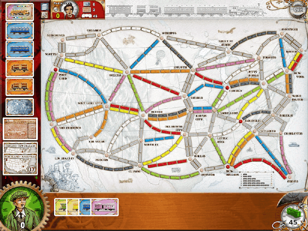游戲開局每個(gè)玩家將獲得45節(jié)車廂并且從四個(gè)隨機(jī)車票任務(wù)中選擇一到兩個(gè),完成車票任務(wù)將得到相應(yīng)的分?jǐn)?shù),游戲結(jié)束時(shí)未完成的任務(wù)將會(huì)扣除對應(yīng)的分?jǐn)?shù)。玩家在出牌建造鐵路的同時(shí),根據(jù)所出的牌數(shù),消耗掉與所出牌數(shù)等量的車廂。當(dāng)有任一玩家消耗完所有車廂時(shí),游戲即告結(jié)束,玩家以此時(shí)的分?jǐn)?shù)高低決定勝負(fù)。
