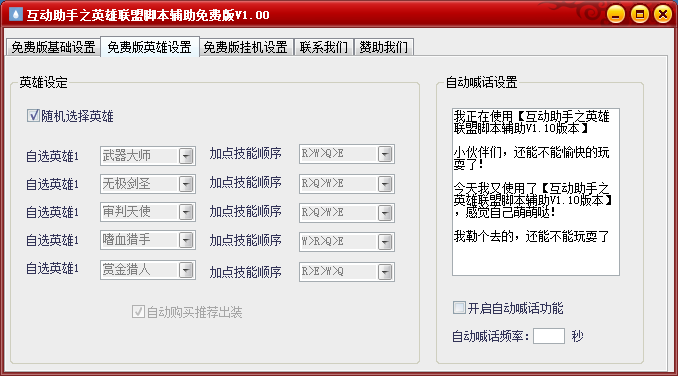 互動助手之英雄聯(lián)盟腳本輔助是一款免費的英雄聯(lián)盟外掛,擁有基礎(chǔ)設(shè)置、英雄設(shè)置和掛機(jī)設(shè)置三大模塊,包含了自定義英雄或隨機(jī)英雄、自動掛機(jī)、喊話等等多項輔助功能。