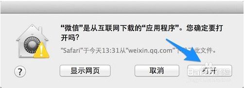 接著在應(yīng)用程序中找到“微信”圖標(biāo),點擊打開,再點擊“打開”按鈕,如圖所示