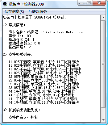 極智聲卡檢測器2008,當然是一款檢測聲卡的軟件啦,他可以檢測你聲卡的名稱、ID、驅(qū)動版本、輸出聲道、支持格式……而且不用安裝