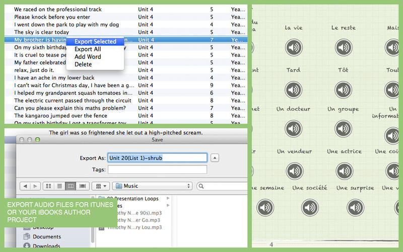 詞匯和句子可以在不同的語(yǔ)言,所以它成為一個(gè)完美的學(xué)習(xí)工具,學(xué)習(xí)語(yǔ)言或任何時(shí)候你需要說的單詞列表。列表是容易導(dǎo)出為完整的測(cè)試或單獨(dú)的音頻文件,可以被拖進(jìn)iTunes或你的最新iBooks作者項(xiàng)目。