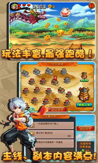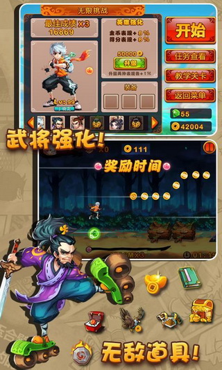 由大連赤犬82開(kāi)發(fā)的這款《跑酷三國(guó)》是以一個(gè)現(xiàn)代少年(程序員)一次穿越旅途為故事背景的三國(guó)題材跑酷游戲。雖然三國(guó)游戲市面上繁多,但像這么搞怪另類的動(dòng)作游戲則并不多見(jiàn),游戲中我們可以看到騎著黑龍的關(guān)云長(zhǎng),駕駛著機(jī)器鳥(niǎo)的曹操,騎著紅色大兔子(赤兔- -?。┑娜酥袇尾?,還有花蝴蝶一樣的貂蟬等等傳奇人物以個(gè)性有趣的方式出現(xiàn)在玩家面前!