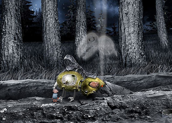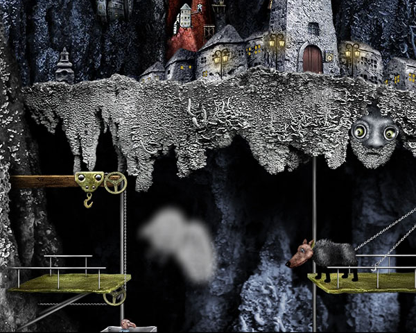 3.點(diǎn)一下主角左邊的小球,轉(zhuǎn)換畫面~看到右邊有狂吠的狗,得引開牠才能過去....點(diǎn)主角旁邊的車箱,被送到下面的平臺(tái),點(diǎn)右邊發(fā)亮的鼻子,右邊的車箱下來了,點(diǎn)車箱,主角爬過車箱轉(zhuǎn)換畫面,看到一個(gè)老人.