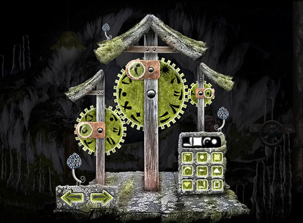 7.來到下面的木橋邊,出現(xiàn)另一個(gè)過關(guān)圖形,按右上紅鈕,點(diǎn)右邊的上箭頭六次,左邊的下箭頭八次,出現(xiàn)開關(guān),點(diǎn)一下,中間橋升起來了,到了另一個(gè)場(chǎng)景~