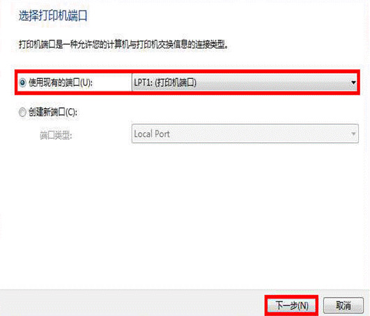 選擇打印機端口,點擊“下一步”