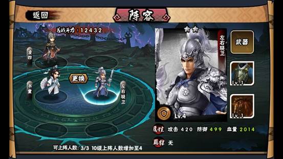 游戲界面:玩家通過“陣容”功能來排兵布陣,“俠士”中能提升麾下人物的能力,為他們裝備相應(yīng)的裝備,使玩家的隊伍在副本中順利闖五關(guān)斬六將,一掃眼前敵方,媽媽再也不用擔心我戰(zhàn)斗力!每個人物可通過“集市”以招募的形式獲得。