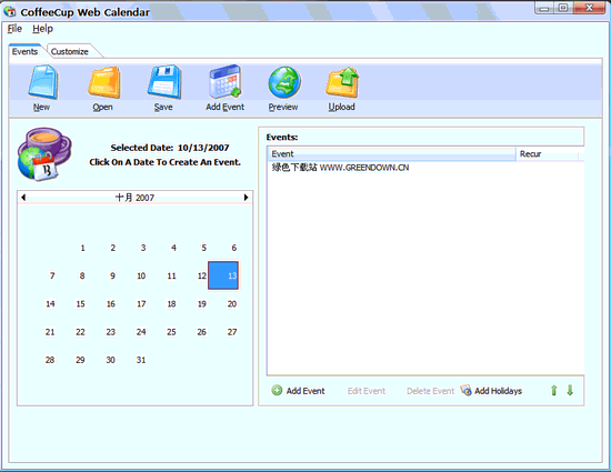 CoffeeCup Web Calendar V4.1 漢化綠色特別版 CoffeeCup Web Calendar是一款漂亮的Flash日歷,可以添加在網(wǎng)頁(yè)上,它可以高亮顯示事件,會(huì)議,節(jié)假日的日期。