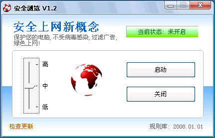 安全瀏覽 (網(wǎng)頁防火墻,上網(wǎng)不再中毒),保護您的電腦,上網(wǎng)時不受病毒木馬感染,可過濾掉廣告和病毒,綠色上網(wǎng)! 本軟件為單個文件,綠色版本無需安裝