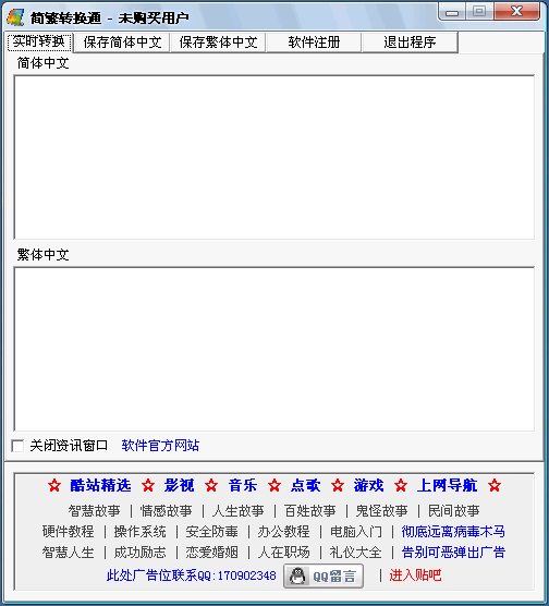簡繁轉(zhuǎn)換通,顧名思義,就是專門幫您進行GB碼與BIG5碼之間轉(zhuǎn)換的工具。它能夠?qū)崟r進行簡體和繁體中文的動態(tài)轉(zhuǎn)換。您不妨下載試試:)