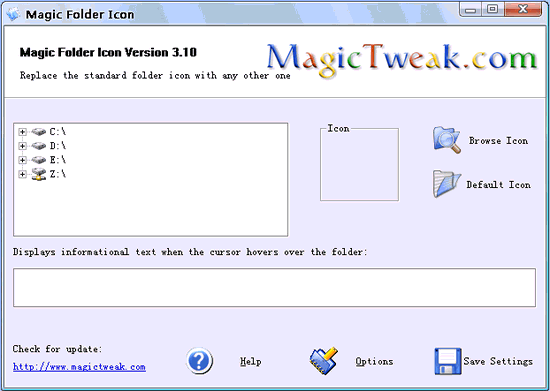 文件多了總是難以管理,給同類型/同范疇的東東定義個(gè)個(gè)性圖標(biāo)不失為方便查找的好方法,Magic Folder (又名 EfreeBuy Folder Icon)就是一款幫您快速編寫desktop.ini文件的免費(fèi)工具。軟件支持ICO、ICON,以及對EXE、DLL等PE文件的圖標(biāo)進(jìn)行索引