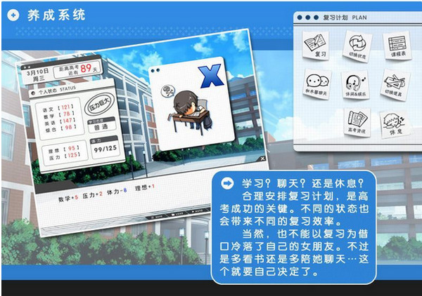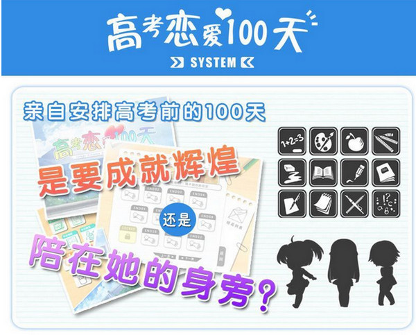 高考戀愛一百天以“高考”為切入點(diǎn),展現(xiàn)高考前一百天的高三生活,玩家對(duì)主角的培養(yǎng)會(huì)對(duì)其高考成績(jī)產(chǎn)生影響,并影響到結(jié)局。因?yàn)橥杲Y(jié)不同選擇,劇情上產(chǎn)生的各種感情糾葛,和女友之間飄忽不定的關(guān)系,還有家長(zhǎng)和學(xué)校的反映以及身邊環(huán)境造成的各種壓力,都是游戲的特色。五十多種不同的結(jié)局,也會(huì)讓玩家體會(huì)到人生的多變,經(jīng)歷磨難后的真正完美結(jié)局也能讓玩家體會(huì)到真摯感情的寶貴。