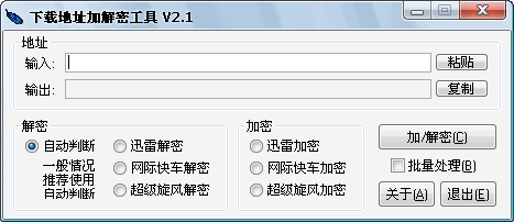 一個(gè)簡單易用的專用下載地址加解密工具. 現(xiàn)在支持迅雷,網(wǎng)際快車,騰訊超級旋風(fēng)的加解密操作,并且完美支持中文的地址