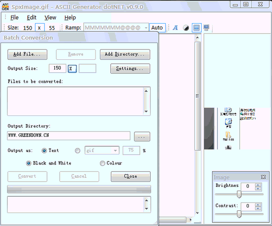 ASCII Generator dotNET V0.9.6 漢化綠色免費版 ASCII Generator dotNet可以把圖片轉(zhuǎn)換為ASCII組成的字符文本??梢詫D(zhuǎn)換的字符文本進行亮度,對比度,甚至色階的調(diào)整,可謂功能強大。ASCII Generator dotNet的轉(zhuǎn)換效果非常棒,你的blog,論壇,郵箱的簽名可以更酷了