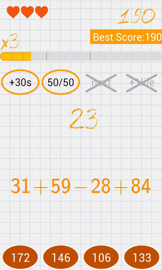 1.游戲畫面采用了當(dāng)下流行的涂鴉風(fēng)格,游戲方式簡單,玩家只要根據(jù)屏幕中央的數(shù)學(xué)題目,選出正確的答案即可。2.游戲難度從低到高,想拿到高分可不容易。屏幕上方有一個獎勵條,當(dāng)玩家答題速度快,且連續(xù)答對的話,獎勵條就會增長,得到的分數(shù)就會有加成。