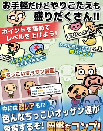 《老頭連環(huán)擊 目撃!ちっこいァ∶サン図監(jiān)》是一款日式休閑類游戲,游戲適合打發(fā)時間,有點小收集的意思,用手指對著小老頭滑動,即可消滅他們,cop 數(shù)可以拿來升級一些道具。