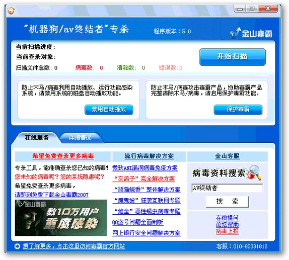清除機(jī)器狗/AV終結(jié)者/8749病毒;修復(fù)“映像劫持”;修復(fù)Autorun.inf;修復(fù)安全模式。使用該專殺工具查殺后,請(qǐng)使用金山毒霸進(jìn)行一次全面殺毒即可