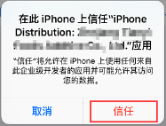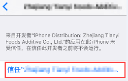 在“企業(yè)級應(yīng)用”列表里面,找到你剛才記住的那個(gè)證書的名稱,點(diǎn)擊它。然后點(diǎn)擊“信任XXXXXXXXXXX”,遇到彈窗“在此iPhone Distribution:XXXXXXXXXXX”點(diǎn)信任即可。