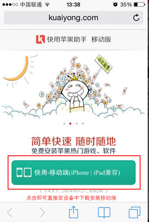 3.Iphone登陸iphone.kuaiyong.com點(diǎn)擊“快用移動端(iphone/ipad)兼容”,即可直接在設(shè)備上下載安裝移動端。