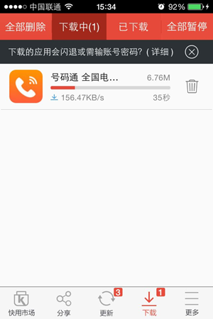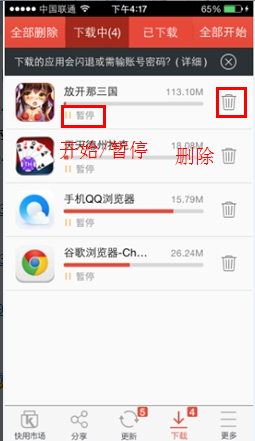 下載中列表會顯示正在下載的應(yīng)用,在這里您可以隨時開始和暫停應(yīng)用的下載,您還可以刪除您不想要的應(yīng)用