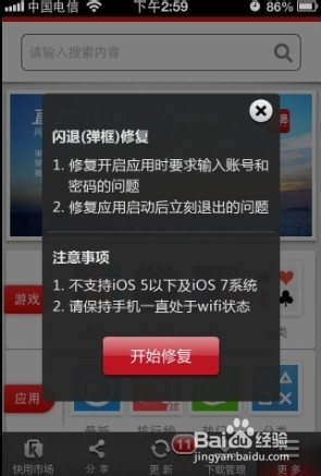 快用手機(jī)端也有閃退修復(fù)功能,目前只支持ios6系統(tǒng)的修復(fù),且成功率較低。建議您移至pc端進(jìn)行閃退修復(fù)。