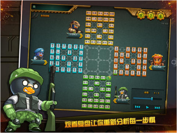 1、嚴(yán)肅而又華麗的游戲風(fēng)格:與四國軍棋充分契合的軍事風(fēng)格,讓您沉浸于四國軍棋的對局中無法自拔。2、方便快速的操控方法:直接點擊棋子移動,在iPad的大屏幕下操作輕松順暢。