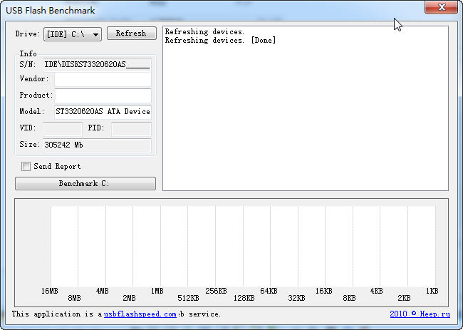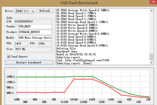 插入設(shè)備后運(yùn)行 USBFlashSpeed,選定盤符后 USBFlashSpeed 會(huì)出現(xiàn)該設(shè)備的一些基本信息,不過(guò)如果你是通過(guò)讀卡器的話就無(wú)法正常讀取到該卡的信息了。點(diǎn)擊「Benchmark」按鈕就可以開始對(duì)設(shè)備進(jìn)行讀寫速度測(cè)試,USBFlashSpeed 會(huì)通過(guò)寫入讀取不同大小的文件來(lái)測(cè)試,左側(cè)會(huì)顯示文字結(jié)果,下方會(huì)通過(guò)圖表的形式來(lái)顯示。