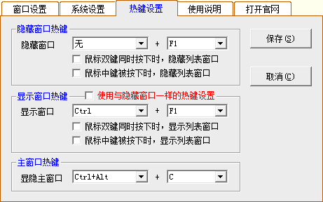 考慮到用戶習慣和操作方便,隱藏窗口和顯示窗口還可以設(shè)置相同或不同的鼠標熱鍵,包括鼠標左右鍵同時按下、鼠標中鍵按下。