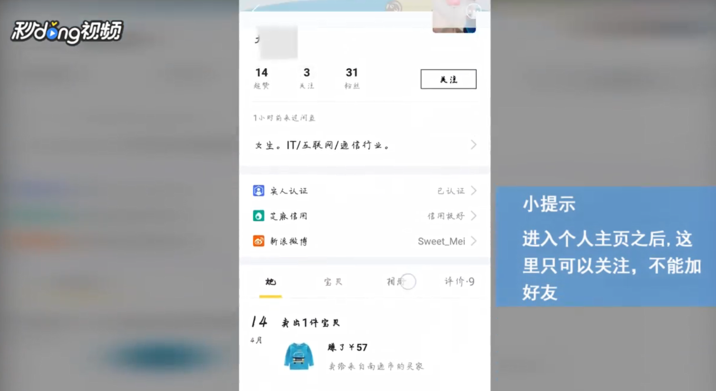 進(jìn)入他的個(gè)人主頁(yè)之后,會(huì)發(fā)現(xiàn)這里可以關(guān)注,不能加好友。閑魚(yú)平臺(tái)是無(wú)法添加好友的,如果您真的需要添的話(huà),需要通過(guò)該用戶(hù)的ID,在旺旺手機(jī)版尋找其旺旺賬號(hào)。