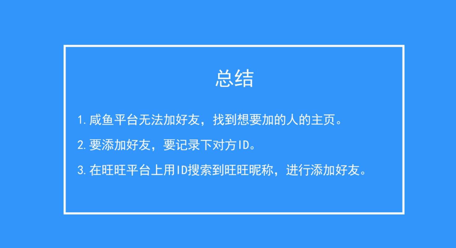 總結(jié):1.閑魚(yú)平臺(tái)無(wú)法加好友,找到想要加的人的主頁(yè)。2.要添加好友,要記錄下對(duì)方ID。3.在網(wǎng)絡(luò)平臺(tái)上用ID搜索到旺旺昵稱(chēng),進(jìn)行添加好友。