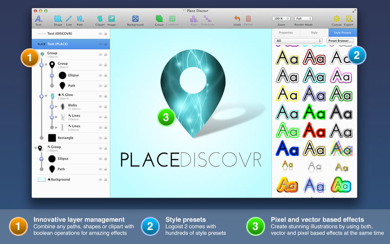 Logoist采用先進(jìn)工具編輯路徑,包括可與其他路徑、剪貼畫、使用布爾操作的文本相結(jié)合的Bézier路徑和的直線形狀。